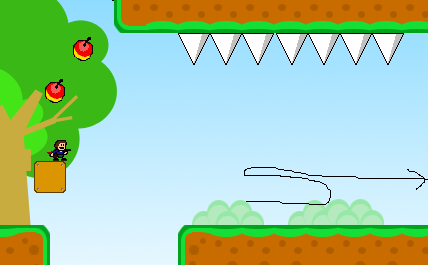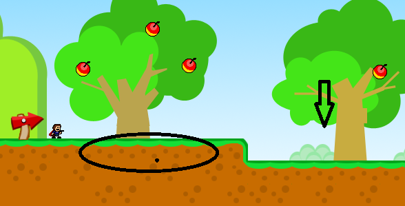 注意圈起来的地方地面会陷下去,然后箭头那里会有苹果飞下来砸你,躲开即可