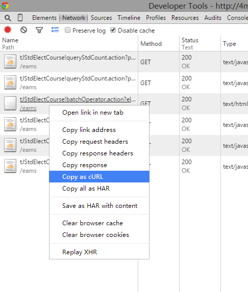 其中那个type为text/html的,对着他点右键,copy as curl